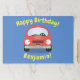 ¡Este adorable auto rojo es lindo y feliz! Dibujado en un divertido estilo personalizado en un fondo azul de verificación.
