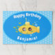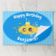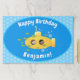 ¡Una alegre aventura submarina amarilla espera! Dibujado en un lindo estilo de ilustracion personalizado en un fondo azul para una celebración divertida!