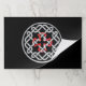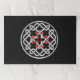 Un conjunto de alfombras de mesa despedazadas con un diseño de nudo celta con una cruz cuadrada roja en el centro.
