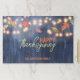 Crea una mesa de Acción de Gracias que irradia calidez y gratitud con este encantador lugar de papel. Sobre un fondo rústico de grano de madera, una hilera de mágicas luces de hadas arroja un suave resplandor, iluminando hojas caídas de otoño en tonos dorados, ámbar y rojos. La frase "Feliz Día de Acción de Gracias" está elegantemente escrita a mano en un guión caprichoso, haciendo una declaración sentida. Este lugar es un lienzo perfecto para su nombre familiar o un mensaje especial, añadiendo un toque de encanto rústico y brillo a su fiesta de vacaciones.