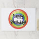Círculos en colores primarios de tamaño creciente (púrpura, azul, verde, amarillo, naranja, rojo), son fondo para el saludo exterior que puede ser personalizado "¡Feliz cumpleaños!". El texto negro tiene una sombra de fondo blanca.