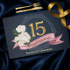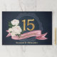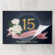 Celebra 15 años con estilo con este elegante lugar de trabajo de aniversario. Una delicada frontera inspirada en un encaje enmarca un audaz "15" dorado que brilla como una joya preciosa. Las peonías y rosas blancas en cascada —símbolos clásicos de romance— se derraman sobre el fondo de la marina profunda. Una cinta rosada de satén lleva el mensaje "¡Feliz aniversario!" y puede ser personalizada con sus nombres, convirtiéndolo en un hermoso y único tributo a su amor duradero.