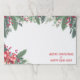 Estas colchonetas de papel lacrimógeno de la época de vacaciones tienen un borde superior de boughs evergreen y bayas rojas. En la parte inferior izquierda hay pepinos atados con un arco de Navidades rojos y blancos de yeso. El texto rojo "FELIZ NAVIDAD Y AÑO NUEVO FELIZ" está en la esquina inferior derecha.