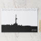 Silueta negra de una plataforma de perforación del petróleo crudo con un calendario de 12 meses en el borde superior.