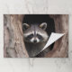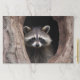 Joven y simpático mapache mirando desde el interior de un árbol grande.
