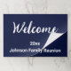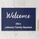 Estas alfombrillas de mesa para reunión familiar de color azul oscuro tienen texto de visualización en blanco. Puede editar el texto para mostrar un mensaje personalizado. La línea superior del texto es un guión que actualmente dice Bienvenidos. La línea central es para el año o fecha. La línea final es para el nombre del evento.