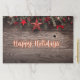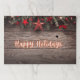 Estas almohadillas de papel hacen grandes placemats para sus reuniones de vacaciones con un diseño festivo y rústico con un borde de garland temático para los Navidades, fondo de madera oscura y "Felices Fiestas" en texto de neón