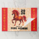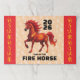 Welcome the Chinese New Year on February 17, 2026, with these paper placemats, which feature the stunning design of a fiery red horse with flame-like mane, tail, and flame motifs, on a peach-colored background with a repeating pattern of Chinese letterforms for the traditional new year salutation. Text can be personalized in both Chinese and English.