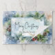 The design centers around a soft, snowy blue frame adorned with classic botanical elements: vibrant holly leaves, bright red berries, crisp pine needles, and textured pine cones. It evokes a cozy, traditional Christmas atmosphere with an artistic, modern twist.