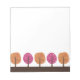 Diseños de Lisa Marie Robinson. Bloque de Bloc de notas con un diseño estacional de otoño/otoño. Cada página cuenta con una hilera de árboles kitsch en tonos rosa y naranja otoñales que dejan mucho espacio para escribir sus notas. Copyright © 2010 Lisa Marie Robinson Todos los derechos reservados. Es ilegal usar o duplicar esto, o cualquiera de nuestras imágenes, sin permiso escrito.