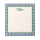 This monogrammed notepad features a blue and cream gingham plaid tartan with an accent of green. Personalize the matching blue and green monogram with your choice of name and initial. Perfect for gift tags and party favors.