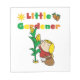 Una pequeña chica rubia levanta la mirada para ver la parte superior del tallo de maíz que crece en su jardín sobre este adorable y colorido diseño de jardinería en bibs, paños para reventar, mantas, bolsitas, platos, almohadas y muchos otros artículos.