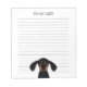 Notas de Dachshund Lover. Gracioso cachorro negro de pelo largo y doxie morado. El texto puede ser personalizado con su nombre o lema. Cuto bloc de notas de papel alineado para las listas de trabajo, tareas pendientes, escuelas y comestibles. Hace un regalo divertido para un amigo para un miembro de la familia que ama los perros más limpios. Disponible en más colores de papel.