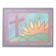 Un diseño de vidrieras que ilustra la mañana de Pascua, con una cruz roja parada en las verdes colinas junto a un ardiente amanecer.