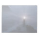 Un faro con una cruz mientras la luz brilla sobre las rocas y los rompientes de una orilla cubierta de niebla, mostrando a los barcos entrantes el camino a la seguridad.