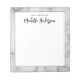 El bloc de notas tiene un elegante borde falso de mármol blanco. En la parte superior del área de escritura blanca, hay texto negro que se puede editar o eliminar para crear un mensaje personalizado. (Muestra: DESDE EL ESCRITORIO DE Michelle Anderson). La línea del nombre es un guión elegante que parece una firma cursiva.