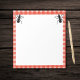 Este bloc de notas es blanco, con un borde de manteles rojos y blancos que se parece a un mantel de picnic con dos grandes hormigas negras divertidas en la parte superior.