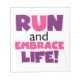Si te gusta correr, correr 5 Ks, 10 Ks, media maratón o maratones, te encantará este colorido diseño de texto en morado y rosa que dice Correr y abrazar la vida! ¡Corre y abraza camisetas vitales, tazas, bolsas, tarjetas, pegatinas, cadenas de llaves, mousepads, estuches para iPhone, imanes y mucho más!