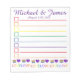 El diseño de la almohadilla de notas de compras de ultramar estilo lista presenta un ilustracion de marca original de una rebanada de torta boda arcoiris y un corazón morado, con LOVE en una fuente arco iris de bonito. Simplemente personaliza con tu información de boda un favor único. En esta tienda también hay muchos bolígrafos ilustrados adicionales. Este diseño también está disponible en otros productos. ¿No ves lo que estás buscando? ¿Necesita ayuda con la personalización? Contacte con Rebecca para que tenga algo diseñado para usted.