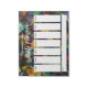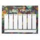 Este audaz planificador semanal se ha configurado con elementos muy básicos que se pueden editar todos... excepto para el encabezado. La frase "planificador semanal" se representó en un moderno tipo de letra informal y se ha colocado, como gráfico, en la parte superior de la página. Utilice los campos de plantilla para agregar los detalles que considere oportunos. El fondo estaba cubierto por una caprichosa pieza de mi arte digital que tiene un toque caleidoscópico, con una variedad de colores que incluyen amarillo dorado, borgoña, agua, azul y verde. Si prefieres personalizarlo aún más, puedes reemplazarlo por tu propio gráfico.