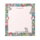 Perfecto para los amantes de los ratones y de los caprichos, este bloc de notas puede ser personalizado con un nombre para un aspecto personalizado. Los ratones del bosque de Woodland corren entre hojas, helechos y flores sobre un fondo azul verde azulado oscuro. También hay bayas y setas para cada ratón. Los verdes, los rosados y los verde azulados desprenden a los ratones grises. Dice "Desde el escritorio de" en la parte superior de la zona de notas rosa pálido. Obra original de Tuzi Williams.