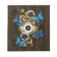 Composición de reloj de vapor redondo con dial numérico romano negro, decorado con arcos de oro y latón, mariposas morfo azules y lentes dañadas sobre fondo rayado marrón. Estilo Steampunk.
