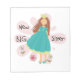 Un chica de cabello marrón con un vestido azul bonito y una corona de princesa con un fondo de flores rosadas en camisetas nuevas de la hermana mayor, botones, bolsos de té, cadenas de llaves, tarjetas, periódicos, almohadas, etiquetas de equipaje, relojes de pared y otros artículos que a la nueva hermana mayor le encantará poseer.