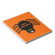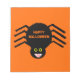 Este impresionante bloc de notas presenta una espeluznante araña negra con ocho piernas peludas, ojos amarillos con grandes pupilas negras y su boca abierta mostrando sus colmillos. Hay un texto naranja que dice "Feliz Halloween" y un antecedente naranja a juego.