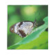 Marrón oscuro y mariposa gris contra un fondo de verde.
