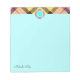 Moda Tartán Personalizado metálico Script Monograma Bloc de notas cian Elegante, moderno y de moda personalizable noepad cuenta con "monograma personalizado" en acero metálico, tartán rosa / amarillo en la parte superior y "notas personalizadas" en la parte inferior del fondo cian. Personalice este encantador bloc de notas como un regalo maravilloso añadiendo su nombre o texto / cambiando el tipo de letra, color, tamaño y posición.