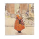 Niña pequeña con ropa sueca tradicional se para en la puerta principal mientras los chicos miran a su alrededor en la esquina de la casa. Bonito arte vintage del pintor sueco Carl Larsson.