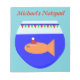 Este impresionante bloc de notas muestra a un divertido Navidad de naranjas pez dorado con un sombrero festivo de santa. El pez dorado está nadando en el agua azul de su pecera. El pez ha decorado la parte superior del tazón con banderas rojas y verdes que deletrean el mensaje "Merry Fishmas". Este divertido pescado de temporada está listo para un gran fiesta de Navidades.