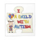 Un pedazo grande del rompecabezas, un corazón integrado por pedazos del rompecabezas, una figura chica cabelludo trigueno del palillo, y el texto que me lee "aman a un niño con autismo" en las camisetas de la conciencia del autismo, las tazas, las tarjetas, los pegatinas, las bolsas de asas, los imanes, los llaveros, los diarios, los mousepads, y otros artículos de la ropa y del regalo.