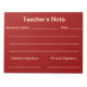 Envíe una nota a casa con su alumno con el Bloc de notas de nuestro personalizado. Se proporciona espacio para el nombre del estudiante, la fecha, una nota y su firma. Puede estar seguro de que el padre de su alumno está al tanto de un problema o evento importante solicitando a su alumno que devuelva su nota con la firma de su padre.