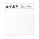 Este bloc de notas tiene un gráfico de espadas, diamantes, palos y corazones con un texto que dice "Juguemos" Genial para póquer, canasta, bridge, rummy de ginebra y todos los demás juegos de cartas