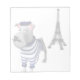 Perro lindo con bigote vestido con una camisa de rayas azules y blancas y una boina con la Torre Eiffel con la bandera francesa al fondo.