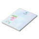 Bloc de notas personalizado con un nombre y una inicial. Diseñado con el ilustracion de una mami y un flamenco rosado de bebé sobre una cama de flores suculentas florales con palmeras verdes que se balancean por la espalda. Tropical y bonito. El fondo es una acuarela azul veraniego con toques de violeta.