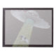 Dibujo a lápiz de color de una desafortunada vaca secuestrada por extraterrestres en un platillo volador en una noche oscura y estrellada. El asustado rebaño se acurruca en el fondo.