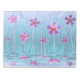 Dibujo digital de flores moradas lindas y estilizadas con brillantes centros rojos. Te miran curiosamente desde la hierba alta junto a una piscina de agua transparente.