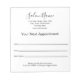 Este recordatorio de cita de salón de belleza dice "Su próxima cita" y tiene líneas para la fecha y hora de la cita, así como el nombre del estilista. En la parte inferior, hay texto que se puede editar para crear un mensaje personalizado si se desea. (Se muestra: Se ruega avisar con 24 horas de antelación si no puede asistir a su cita). Hay texto adicional cerca de la parte superior para el nombre del salón y su dirección, número de teléfono y sitio web. Todo el texto se puede editar o eliminar. El texto es negro.