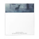 Bloc de notas con una foto de un ciervo majestuoso con cuervos parados en un bosque oscuro entre árboles iluminados por el sol. Nieve por todas partes.