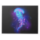 Gran medusa azul, de dibujo artístico, brillante y brillante, con largos tentáculos sobre fondo negro con bioluminiscencia violeta. Luminosas medusas.