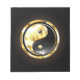 Joyería, oro y símbolo yin yang negro sobre fondo negro. Oro yin yang.