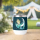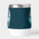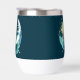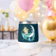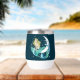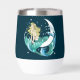 Una sirena de pelo rubio en una luna creciente con una cola de color verde azulado con agua, burbujas de agua y estrellas alrededor. Todas están decoradas en un estilo Art Déco4.