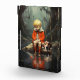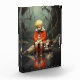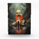 Un niño con una chaqueta roja sentado en una roca por un cuerpo de agua tranquilo y reflexivo, acompañado por su perro. El chico parece triste y su fiel compañero se compadece con él. El lugar está situado en un bosque místico de ambiente tranquilo. Photoshop CS5 de arte digital