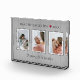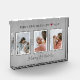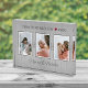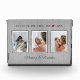 Personalice un recuerdo único para una nueva madre celebrando su primer día de la madre con este collage de fotos de tres personas. El diseño de los bloques de fotos presenta tres fotografías rodeadas por un marco elegante con un texto moderno con el primer saludo del Día de la Madre y un año separado por un solo corazón rojo. El fondo es un sencillo patrón rústico de madera gris.