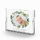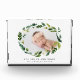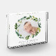 El elegante bloque de bebe keepsake cuenta con una foto horizontal o paisajística favorita de tu pequeño, enmarcada con una corona oval de frondosos follajes botánicos verdes y flores blancas. Personaliza con el nombre del bebé y las estadísticas de nacimiento que hay debajo.