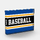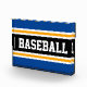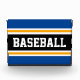 Este diseño deportivo y atlético presenta texto en negrita de BASEBALL dentro de una franja negra de centro ancho resaltada con pinstripes blancas y amarillas contra rayas exteriores azul marino. El texto se puede personalizar.