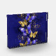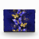 Composición de lujosas mariposas de zafiro y joyas de oro sobre fondo de textura azul.
