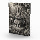 Hermoso conejo en un jardín de setas con árboles y hojas dibujando.